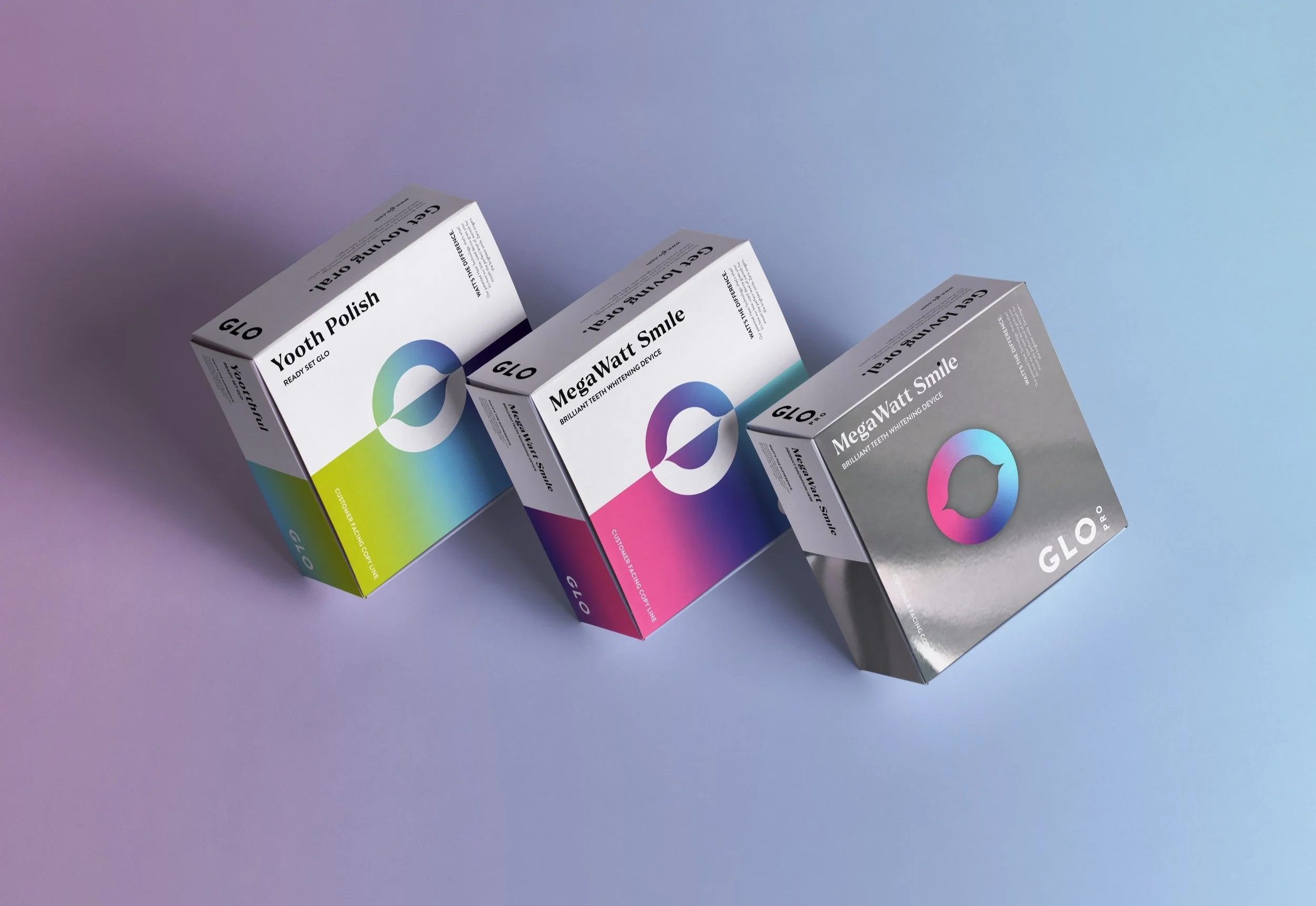 The energetic gradients. take inspiration from Glo’s patented thermo science, Where red to blue lights whiten teeth. These gradients Compliment a core palette of white black and mirror foiling.